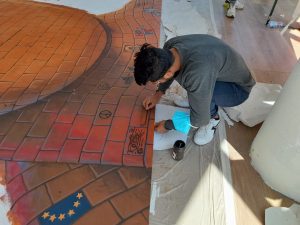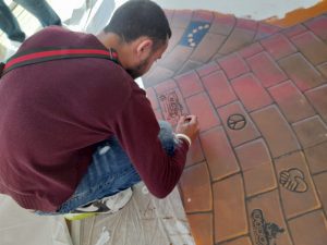 I giovani migranti, Masum, Hossain, Hamza, Eliaprovenienti dal continente africano e asiatico, sotto la guida di Nino Florenzano, hanno dato il loro contributo alla realizzazione del murales “adottando” un mattoncino e disegnando l’immagine di una barca ad evocare il viaggio migratorio attraverso il Mar Mediterraneo.