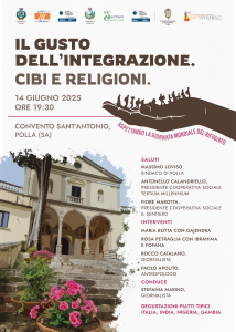 Sabato 14 giugno, alle ore 19,30 presso il Convento di Sant’Antonio a Polla (SA) si svolgerà l’evento “Il gusto dell’Integrazione. Cibi e Religioni ” .
